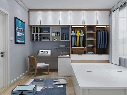 床尾的一整面墻可以定制一個(gè)頂天立地收納柜,柜子中間留出一個(gè)桌子的位置,平時(shí)用來(lái)處理臨時(shí)工作,或者作為學(xué)習(xí)區(qū)域。